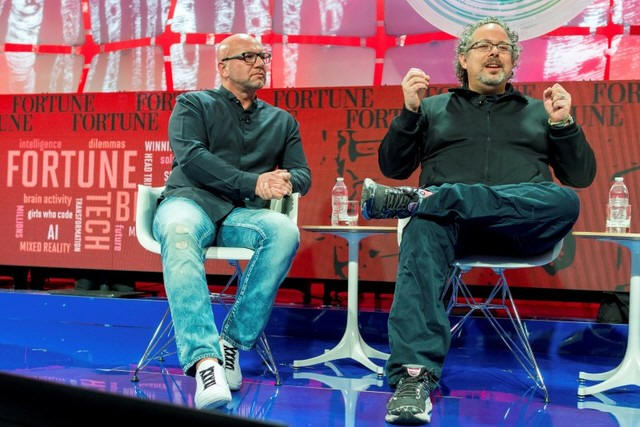 Rony Abovitz (R), CEO of Magic Leap speaks as Brian Wallace, CMO of