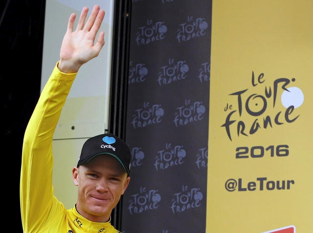 Yellow jersey leader Team Sky rider Chris Froome of Britain reacts