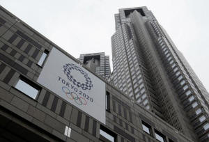 Tokyo 2020 Olympic games emblem is displayed at Tokyo Metropolitan