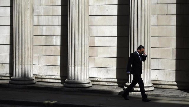 A man speaks on his phone outside the Bank of England in London,