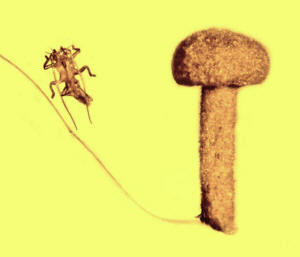 stick" is shown beside a mushroom entombed in amber fossil which is