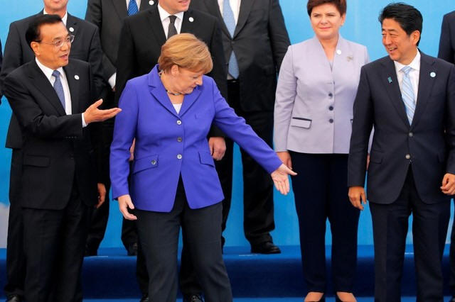 German Chancellor Angela Merkel gestures between Chinese Premier Li