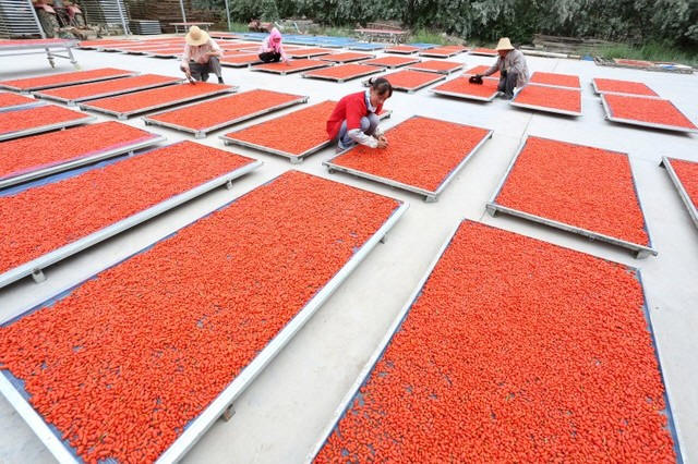 Workers dry wolfberries at a yard in Linze, Gansu Province, China,