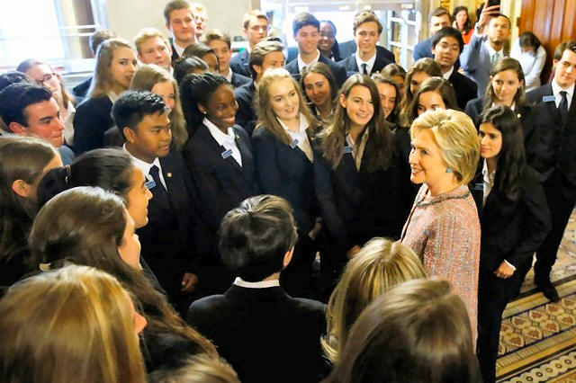 Democratic U.S. presidential candidate Hillary Clinton speaks with