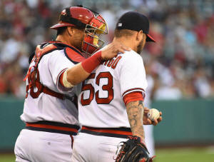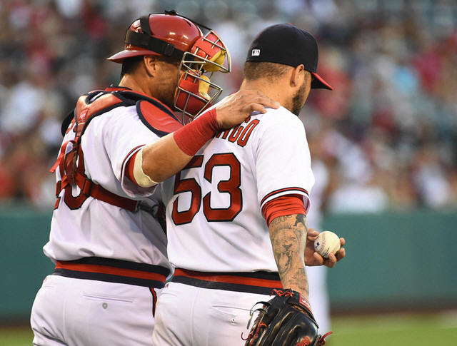Angels catcher Geovany Soto (18) talks with starting pitcher Hector