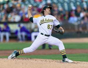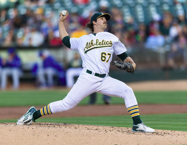Athletics starting pitcher Daniel Mengden (67) pitches against the