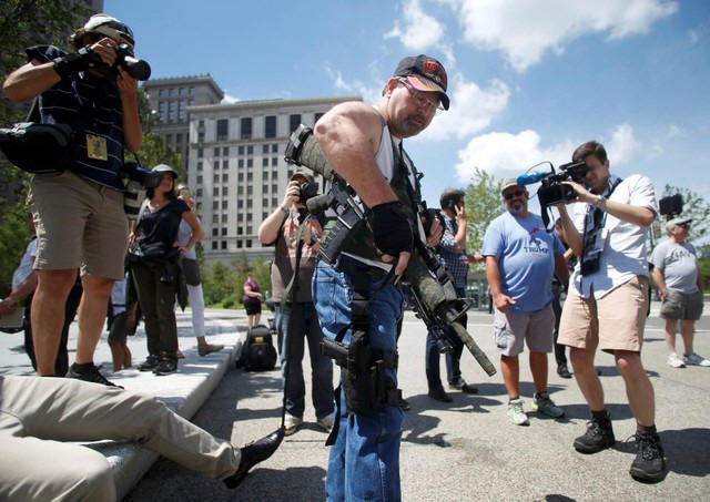 Steve Thacker carrying a rifle and a handgun is surrounded by news media