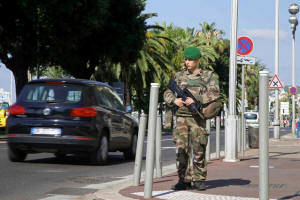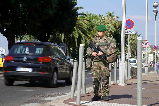 A French soldier patrols on the Promenade des Anglais in Nice before