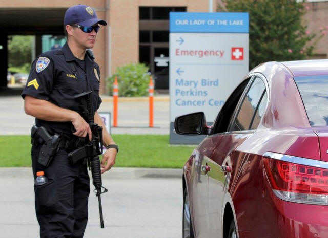 A police office armed with a rifle guards the entrance to Our Lady of the Lake Hospital after a fatal shooting of police officers in Baton Rouge, Louisiana July 17, 2016. REUTERS/Jeffrey Dubinsky |