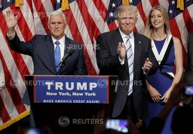 running mate as Trump's daughter Ivanka (R) looks on in New York