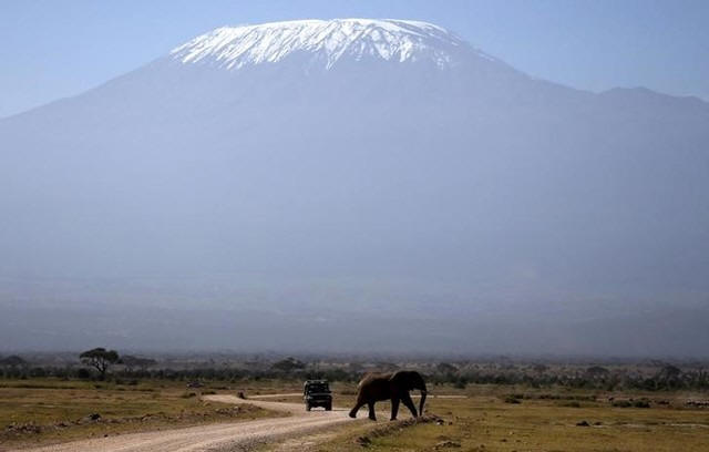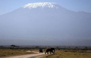 Kilimanjaro is seen behind an elephant in Amboseli National park