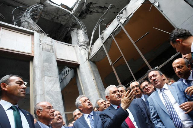Turkey's Prime Minister Binali Yildrim (C) visits damaged parts of