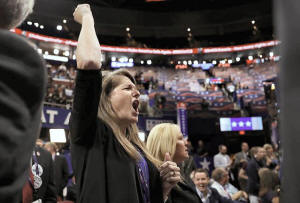 A delegate yells after the temporary chairman of the Republican National