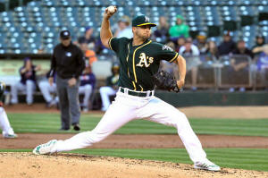 Athletics starting pitcher Kendall Graveman (49) throws to the