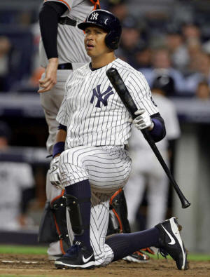 Yankees designated hitter Alex Rodriguez (13) is slow to get up
