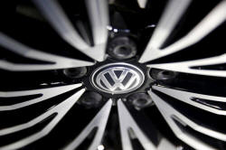 A Volkswagen sign is seen on a wheel of a car presented during an