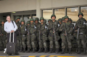 A passenger waits as Brazilian Air force soldiers patrol the Tom