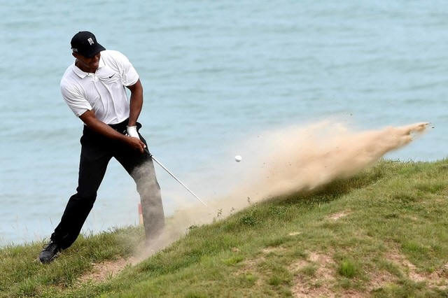 Tiger Woods plays from the sand on the 4th hole during the second
