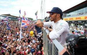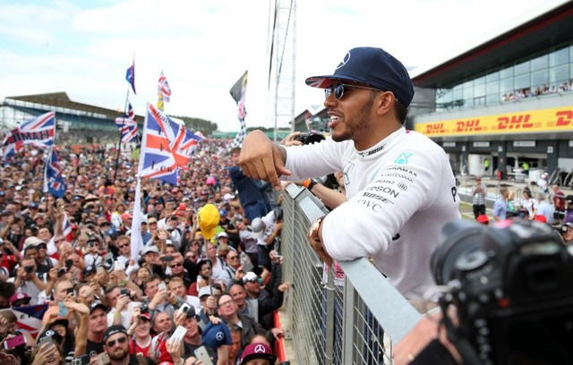 Mercedes' Lewis Hamilton celebrates with fans after winning the race