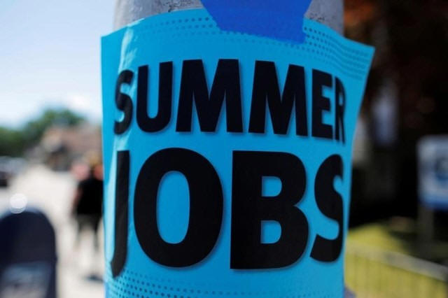 A sign advertising "Summer Jobs" hangs on a lamp post in Somerville,