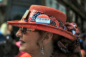A woman wears a hat with a pin in support of Donald Trump near the site