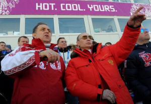 Mutko (L) watch the cross country skiing men's relay during the