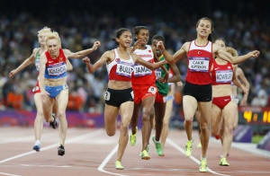 Yusuf Jamal (C) in the women's 1500m final during the London 2012