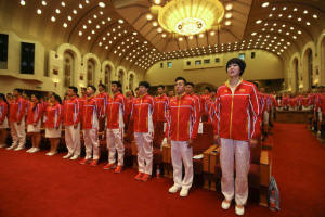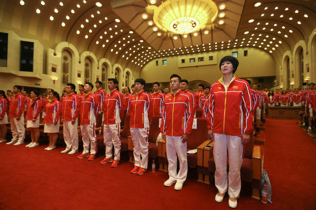 China's athletes for the 2016 Rio Olympics sing the Chinese national