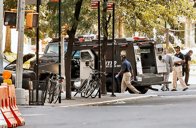 fake bomb into police van in Manhattan