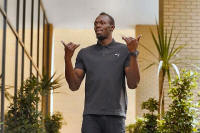 Jamaica's Usain Bolt poses before the press conference Action