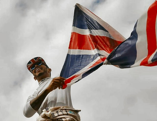 Mercedes' Lewis Hamilton celebrates after winning the race