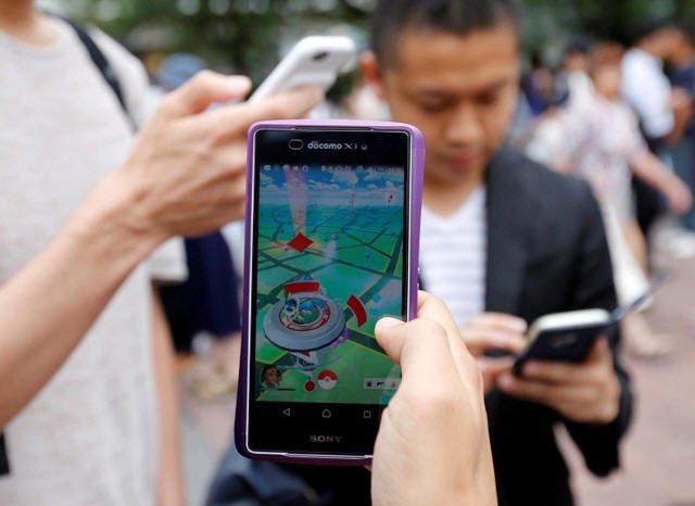 Men play the augmented reality mobile game "Pokemon Go" by Nintendo
