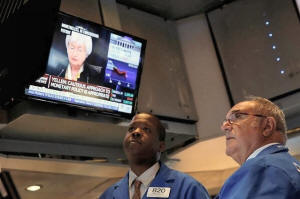 Traders work as Federal Reserve Chair Janet Yellen speaks on a