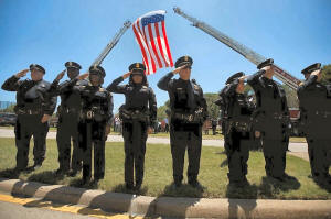Police officers salute the hearse as they attend the funeral of
