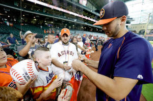 Astros shortstop Carlos Correa (1) signs autographs for fans before