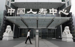 A woman walks past China Life Insurance Co Ltd headquarters building