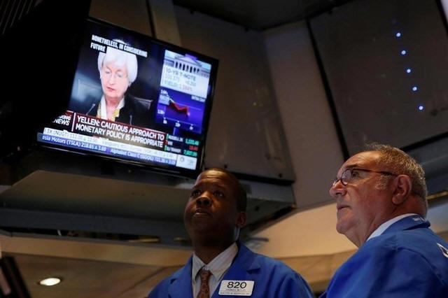 Traders work as Federal Reserve Chair Janet Yellen speaks on a