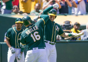 Athletics designated hitter Billy Butler (16) is congratulated by