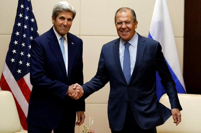 Secretary of State John Kerry (L) greets Russia's foreign minister