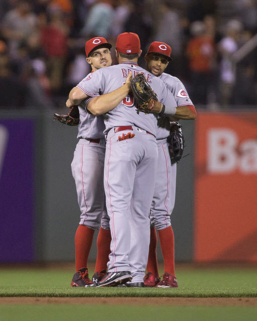 Reds left fielder Adam Duvall (23), right fielder Jay Bruce (32),