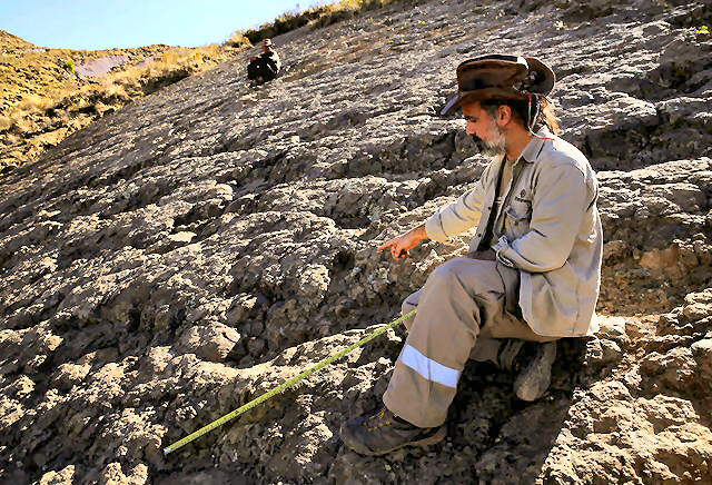Paleontologist Sebastian Apesteguia points to a dinosaur's