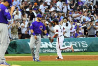 hitting a solo home run against Chicago Cubs starting pitcher Kyle