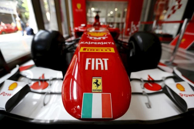 Ferrari and Fiat logos and a Italian flag are pictured on a