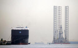 Part of an offshore drilling platform (R) is towed past a car