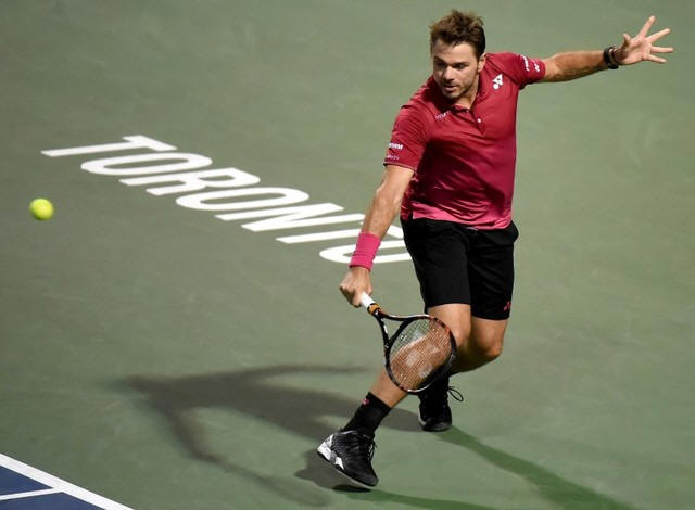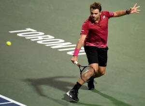 Stan Wawrinka of Switzerland hits a shot against Mikhail Youzhny of