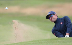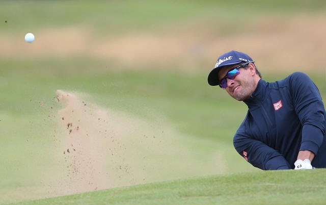 Australia's Adam Scott hits out of the bunker on the first hole