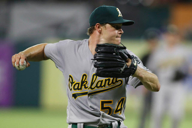 Athletics starting pitcher Sonny Gray (54) throws to first base for