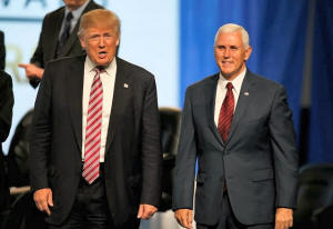 nominee Mike Pence (R) arrive to speak at the Veterans of Foreign Wars