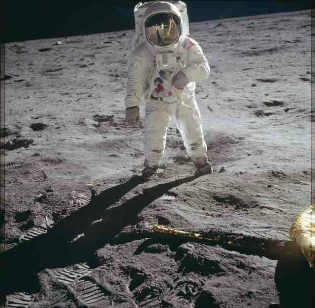 Astronaut Edwin E. Aldrin Jr., lunar module pilot, walks on the