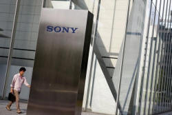 A man walks past the Sony brand logo outside the headquarters of